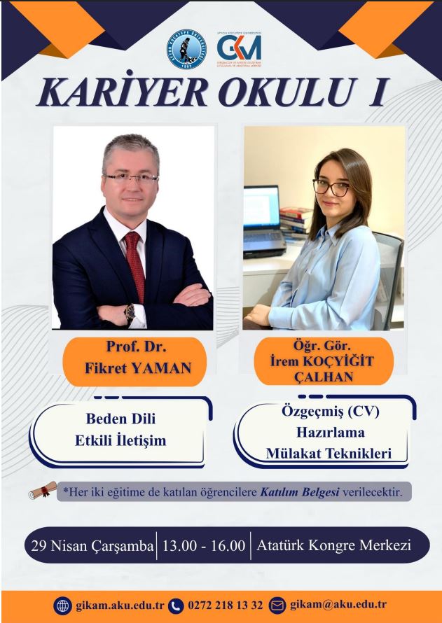 Üniversitemiz Girişimcilik ve Kariyer Geliştirme Uygulama ve Araştırma Merkezi tarafından organize edilen; beden dili, etkili iletişim, özgeçmiş hazırlama ve mülakat teknikleri konularını kapsayan “Kariyer Okulu I” eğitimi 29 Nisan 2026 tarihinde gerçekleştirilecektir.
