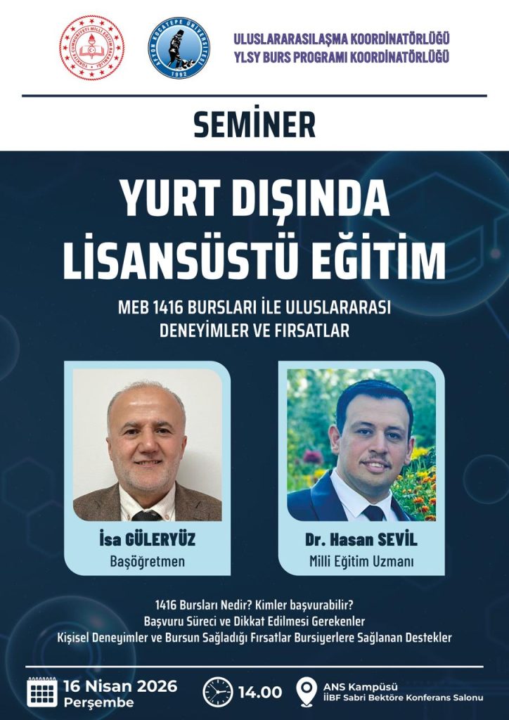 Milli Eğitim Bakanlığı Yükseköğretim ve Yurtdışı Eğitim Genel Müdürlüğü tarafından yürütülen 1416 sayılı Kanun kapsamındaki YLSY (Yurt Dışına Lisansüstü Öğrenim Görmek Üzere Gönderilecek Adayları Seçme ve Yerleştirme) Burs Programı’nın tanıtım toplantısı üniversitemizde gerçekleştirilecektir.